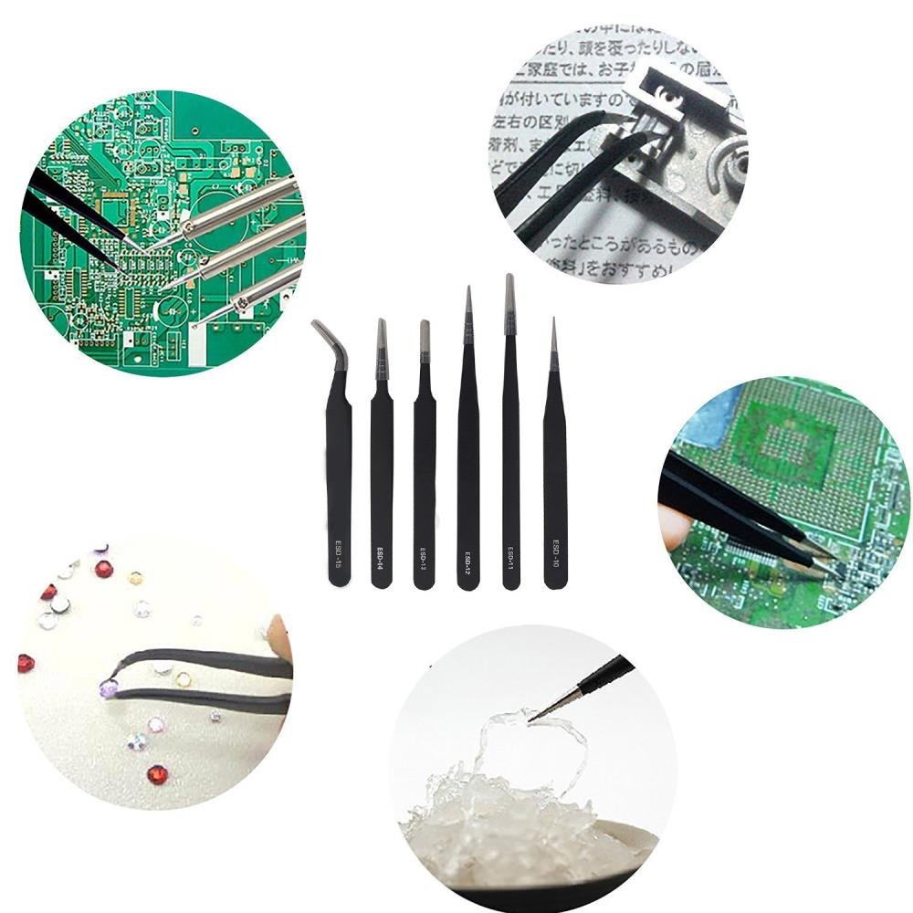 This 10-piece professional tweezer set is designed for delicate, high-precision work in electronics, watchmaking, jewelry, crafting, and repair. Each tweezer is ESD-safe and coated with black nylon to prevent static damage to sensitive components. A variety of tip shapes allow you to handle intricate tasks with accuracy and ease.