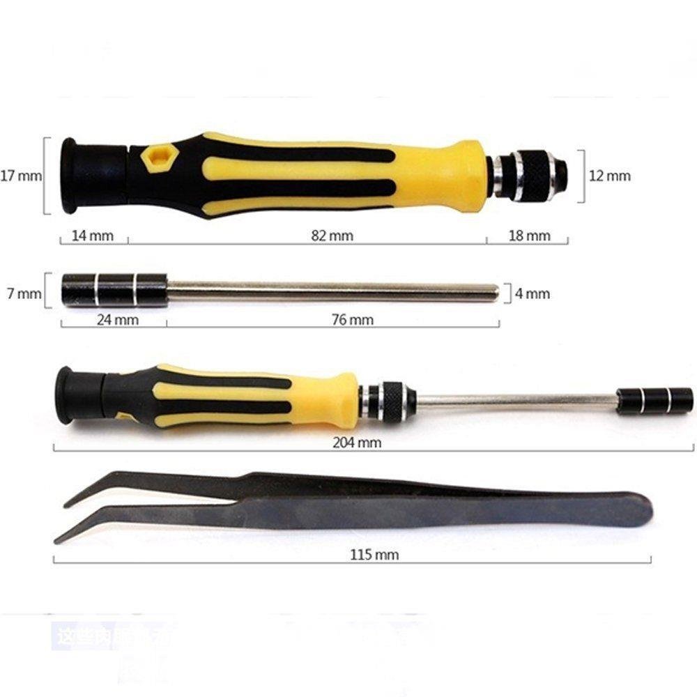 Includes: Multiple driver bits, extension shaft, tweezers, and pry tools