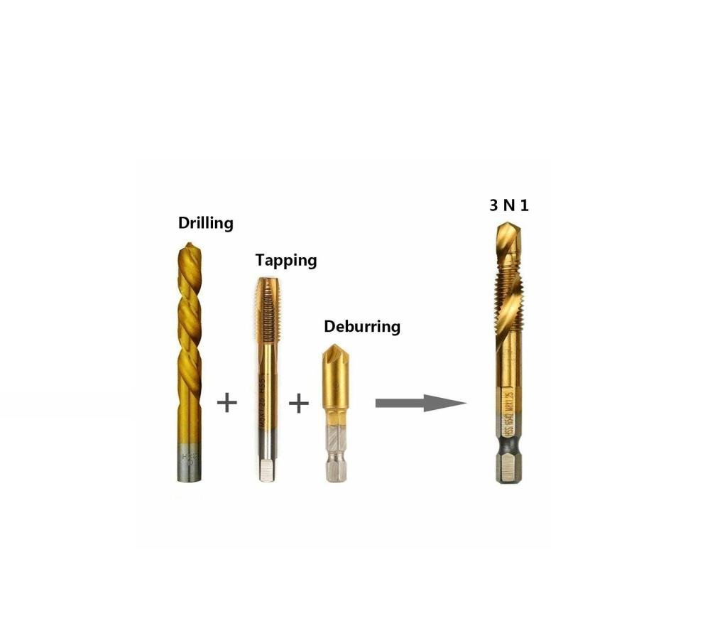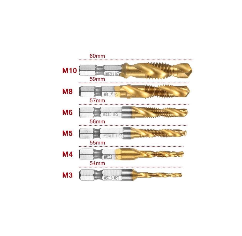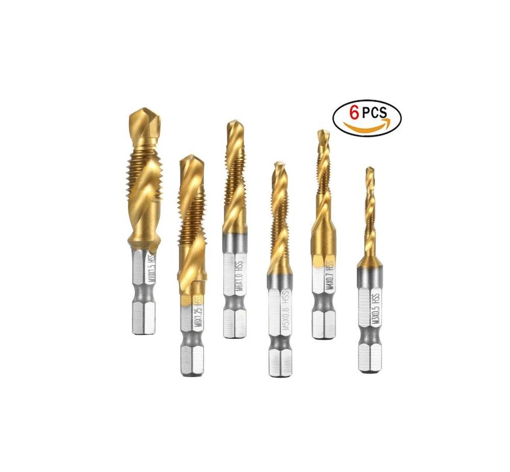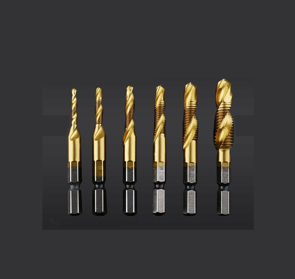 6pcs Countersink Tap Drill Bit Set, a multifunctional solution designed to drill, tap, and countersink in one seamless operation. Made from high-speed steel and coated with durable titanium, this set is ideal for professionals and DIYers working with wood, plastic, aluminum, or soft metals. The hex shank design ensures a secure grip in standard drill chucks and quick-change systems.